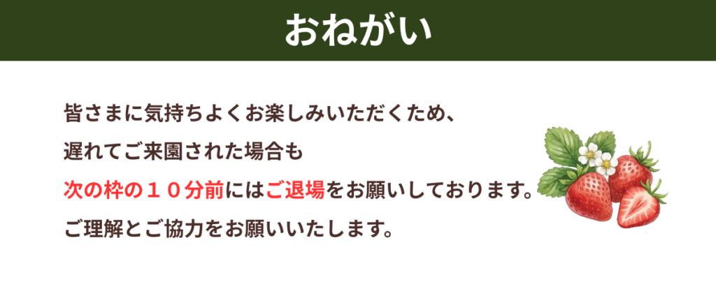 その場合1日で最大50名までとさせていただきます。 - いちごの生育不良等により予約をお断りさせていただく場合があります。ご了承ください。
